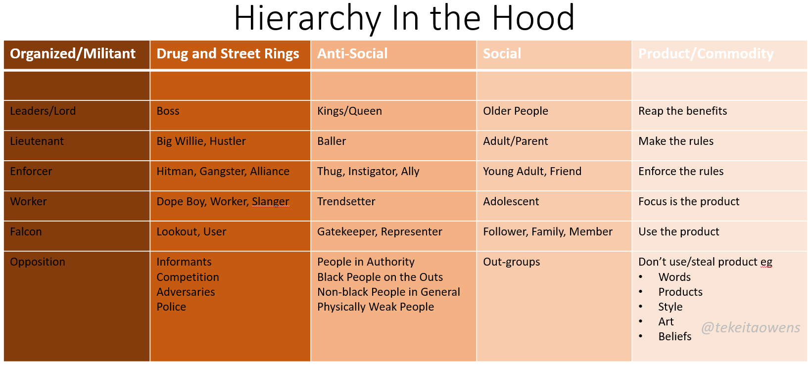 Rap music reflected the hierarchy in the hood: social rights, anti-social behavior, drug rings, organized crime, and black militant movements. The record labels were funded by drug rings and the rappers “represented” their street and cities like griots reciting their rise through the drug ring ranks. Those who didn’t sell drugs rapped about their survival and rise in the anti-social ecosystem or what they call “the come up”. Everyone else could only relate to, understand, emulate or “respect the culture”. The product was not just a song but an image of inner-city life and the ways, style, beliefs, and language of hierarchies in the hood. All of it easily packaged and sold to an ignorant mainstream society.